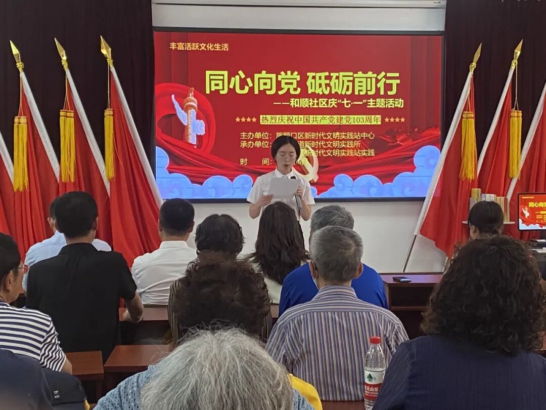 “同心向党 砥砺前行”活动现场,登峰街道领导与和顺社区党员、社区工作者一起重温入党誓词,聆听红色歌曲和革命诗词朗诵,参与党史知识趣味问答等一系列“庆七一”安排将活动氛围引向高潮,共同庆祝中国共产党成立103周年。