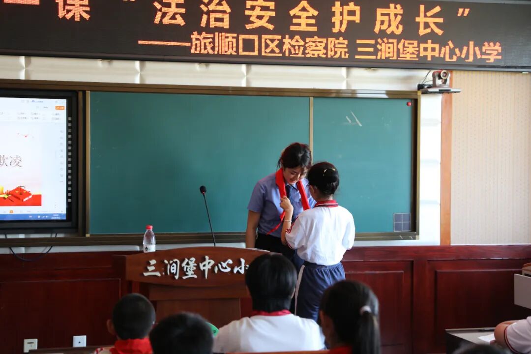 9月2日下午,法治宣讲课程开启前,该校的学生代表为前来授课的检察官姐姐系上心爱的红领巾表示欢迎。付娆以现场+视频直播的方式,为师生讲述涉及校园安全、网络安全等国家有关未成年人权利保护的法律法规,通过真实案例、法律知识、趣味问答等以案释法,受到了师生的一致好评和感谢。